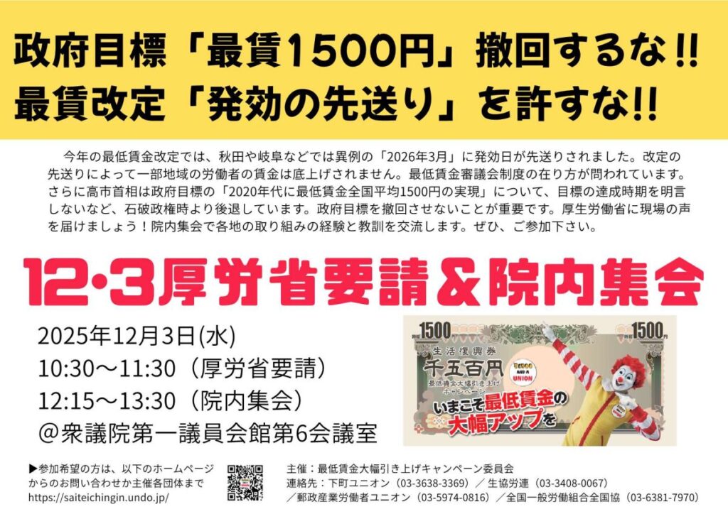 最低賃金大幅引き上げキャンペーン@東京は 2025年7月14日、東京地方最低賃金審議会と労働局長に対して要請行動を行います。 東京都...