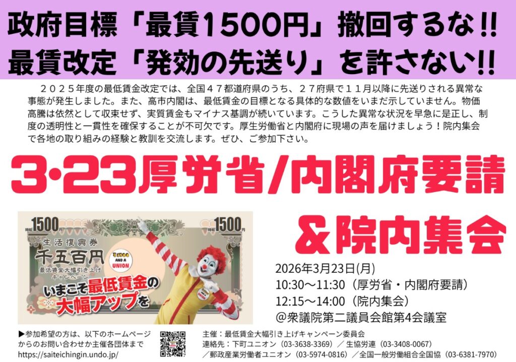 最低賃金大幅引き上げを実現するために──3月23日、声を届けよう! 2025年度の最低賃金改定において、全国47都道府県のう...